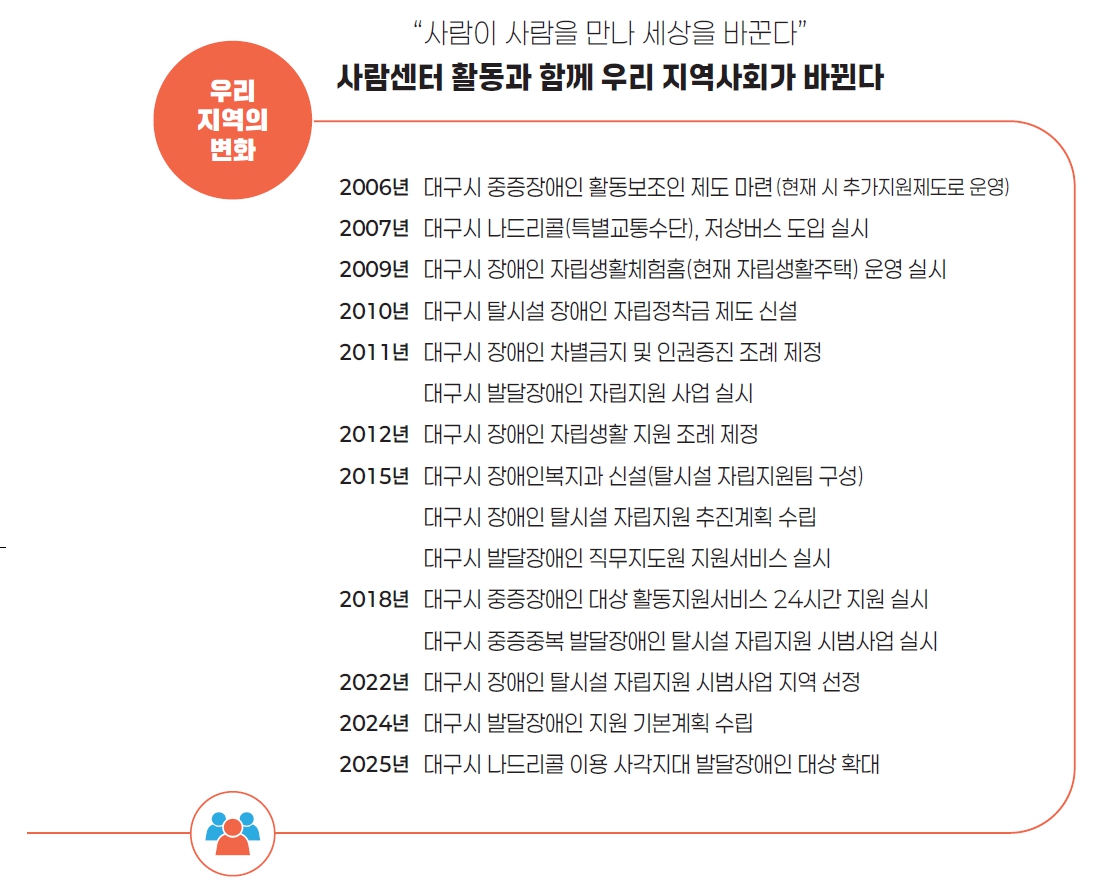 2006년 대구시 중증장애인 활동보조인 제도 마련 (현재 시 추가지원제도로 운영)