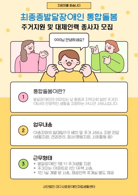 [채용공고] 최중증발달장애인 통합돌봄서비스 제공인력 모집(주간/야간)